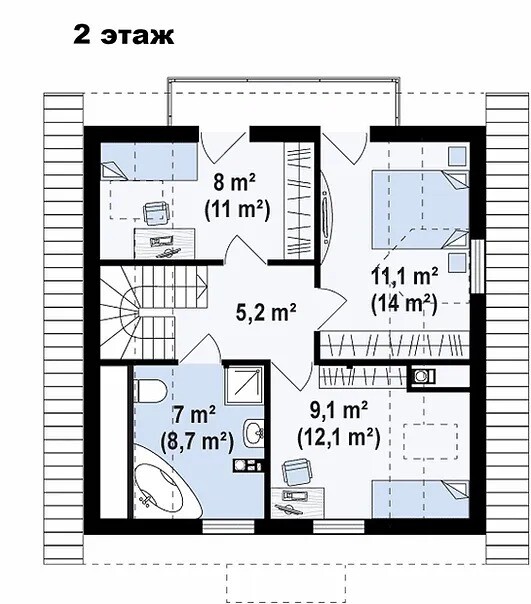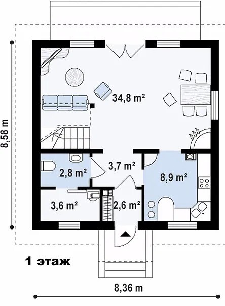 Размер дома: 8,58м х 8,36мПлощадь здания: 107,5 м2